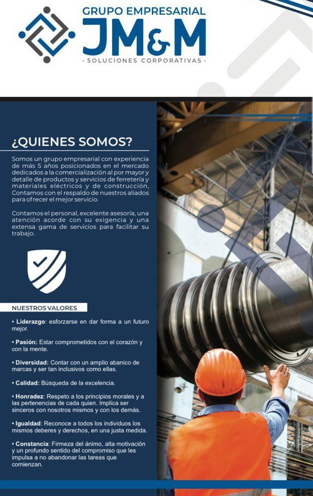 Somos un Grupo empresarial con mas de 5 años de experiencia en la comercialización de productos y servicios de ferreteria, materiales eléctricos y para la construcción, contamos con el respaldos de nuestras marcas aliadas para brindar seguridad y garantía a nuestros clientes.